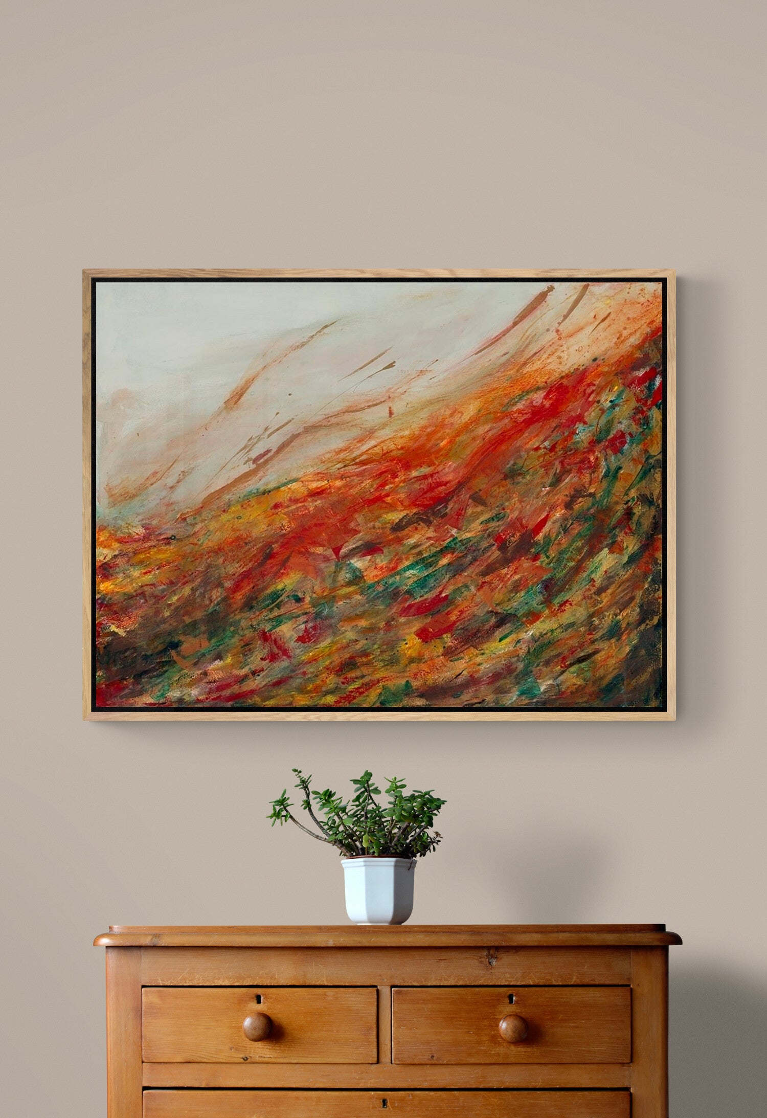 "Autumn Leaves," bursts with vibrant autumnal hues and a touch of gold, capturing the essence of leaves rustling in the breeze and gathering in a pile on the ground. The dynamic composition evokes a sensory experience, where you can almost feel the wind and hear the satisfying crunch of leaves underfoot. This artwork beautifully conveys the joy and nostalgia of the fall season through its lively colors and expressive movement. This artwork comes in a beautiful oak floating frame.