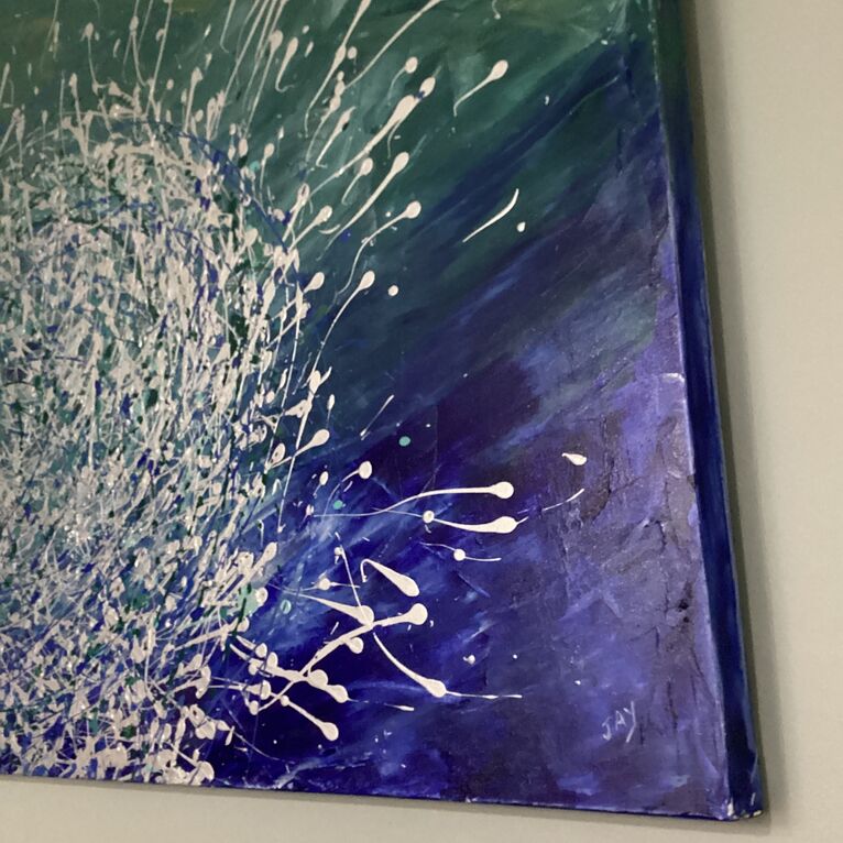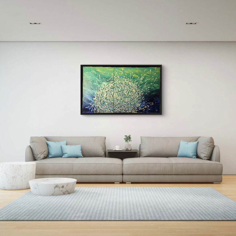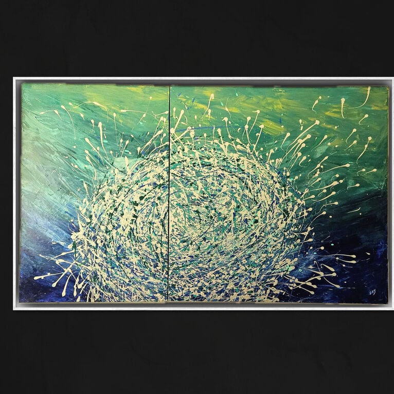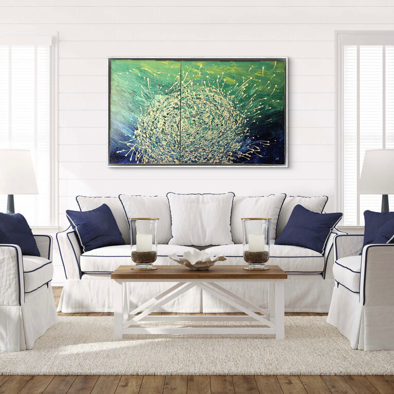 Part of my ocean Series Baitball 2 is highly textured and will brighten any space. With its soothing colours you will feel like you are on an idyllic island holiday watching as the schools of baitfish swim in the ocean. This comes infrared but with a framing option. It is a diptych comprising of 2 canvasses.