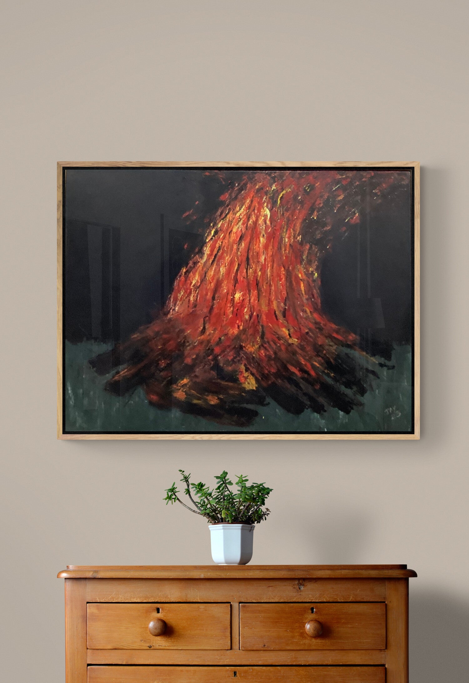 Imagine a cool winter night, the dark bushland surrounding you in an embrace of stillness and serenity. My artwork, *Winter Campfire*, transports you to this serene scene, where the glowing red and orange flames of a campfire stand as the heart of the moment. Painted in a figurative abstract style, the textured dimensional acrylic brings the fire to life, with embers floating gently through the air. As you gaze upon it, you can almost feel the comforting warmth radiating from the canvas, inviting you to share in the timeless experience of gathering around a fire under the night sky.