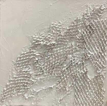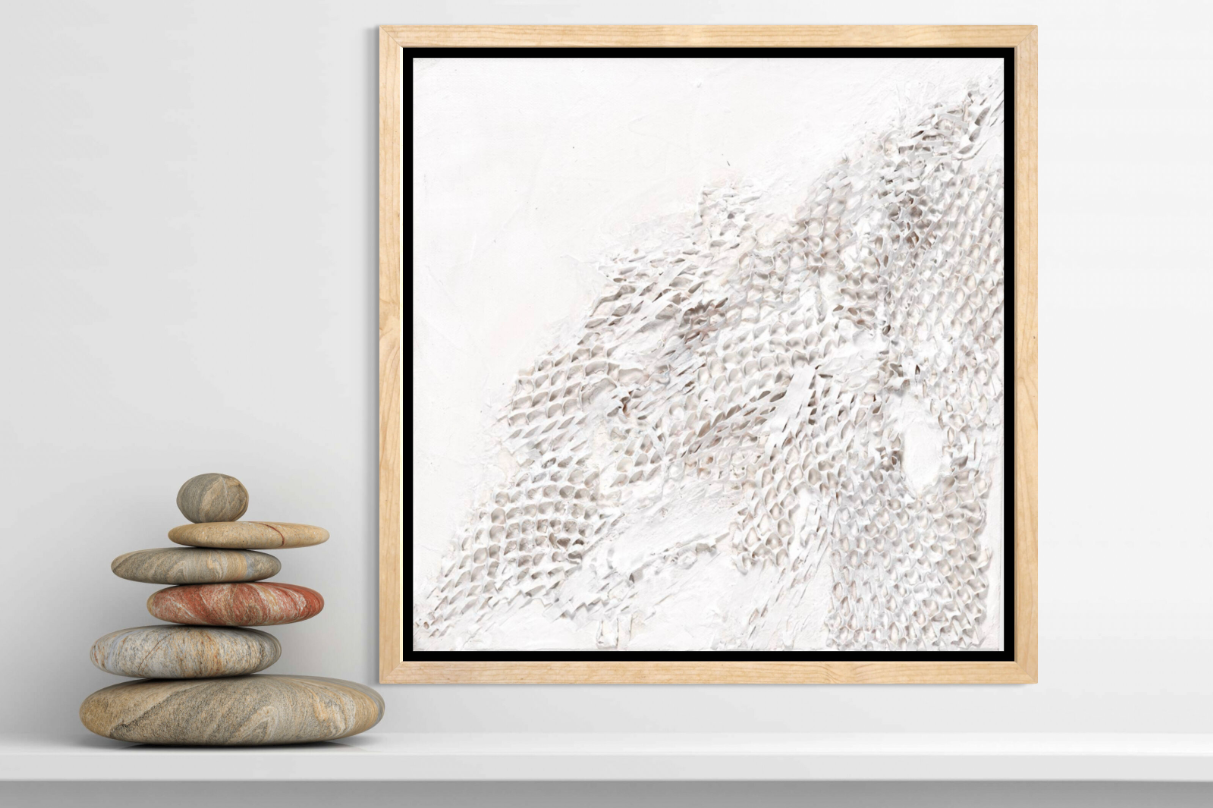 Step into ‘ The Hornets Nest ‘ it’s white on white canvas reveals a close-up of a hornets nest. As you study it, you can almost feel the hum of the hornets and the danger they represent. It’s a warning, a reminder to tread carefully in life.