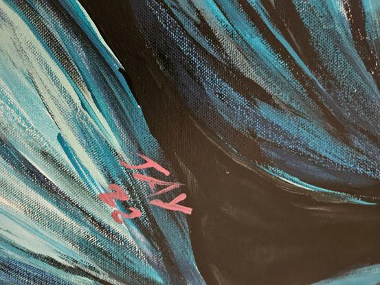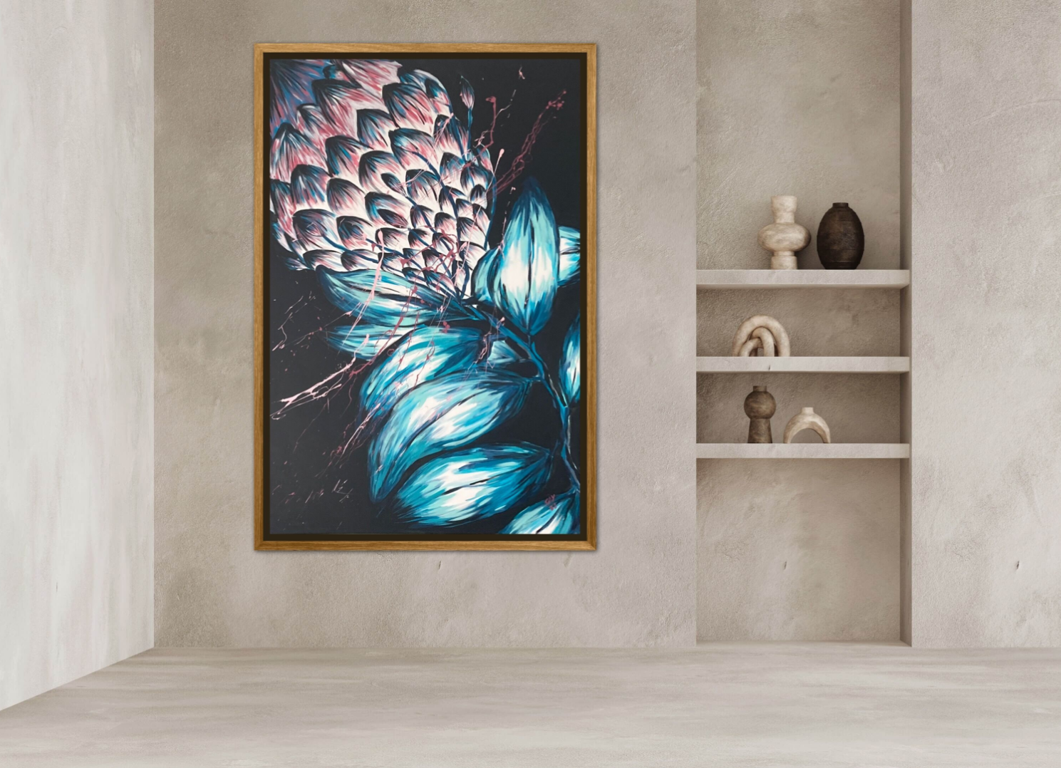 This painting of an abstract protea is sure to cheer up any space. It is painted from my imagination in a time of my life when things were not going so great. Proteas were not out in flower and for some reason I felt like having them in my house so I painted instead. It has my signature splash of pink across. Looks great hung in either landscape or portrait orientation. Let it cheer up your space the way it did mine.