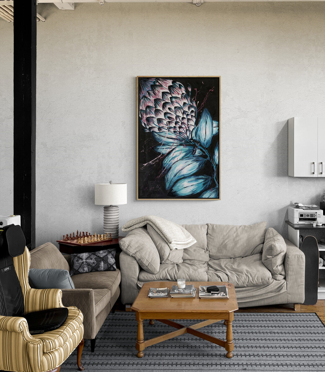 This painting of an abstract protea is sure to cheer up any space. It is painted from my imagination in a time of my life when things were not going so great. Proteas were not out in flower and for ssome reason I felt like having them in my house so I painted instead. It has my signature splash of pink across. Looks great hung in either landscape or portrait orientation. Let it cheer up your space the way it did mine.