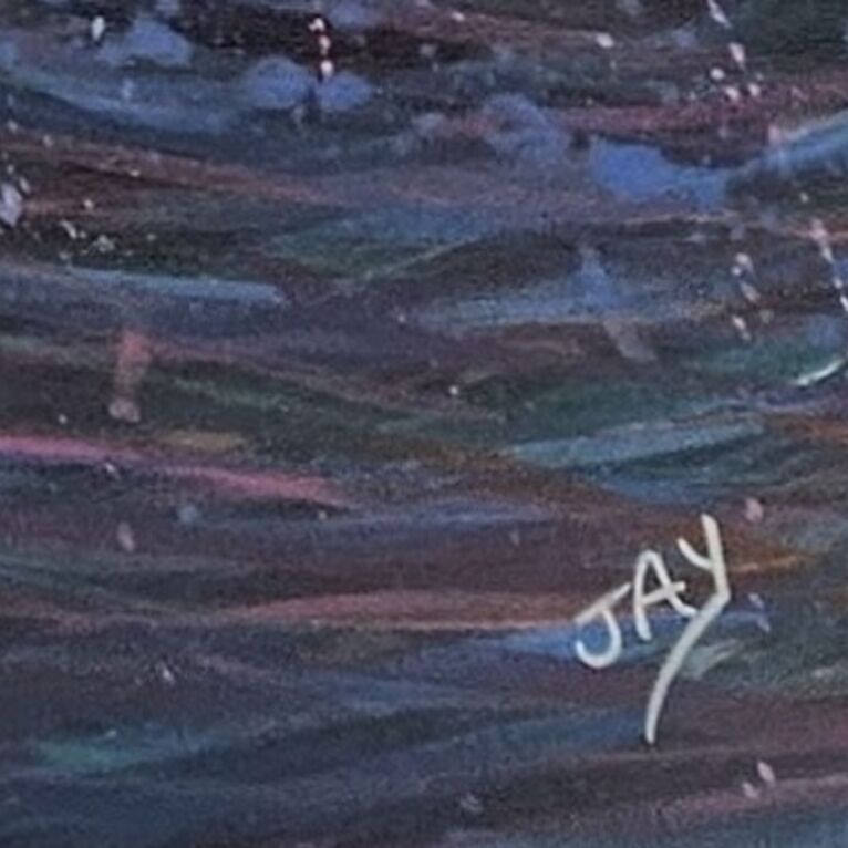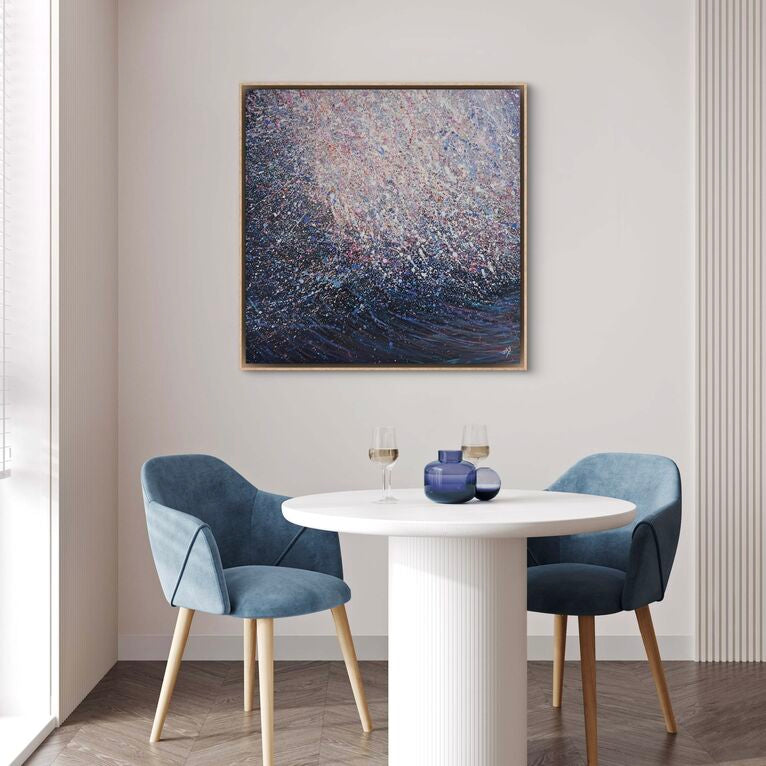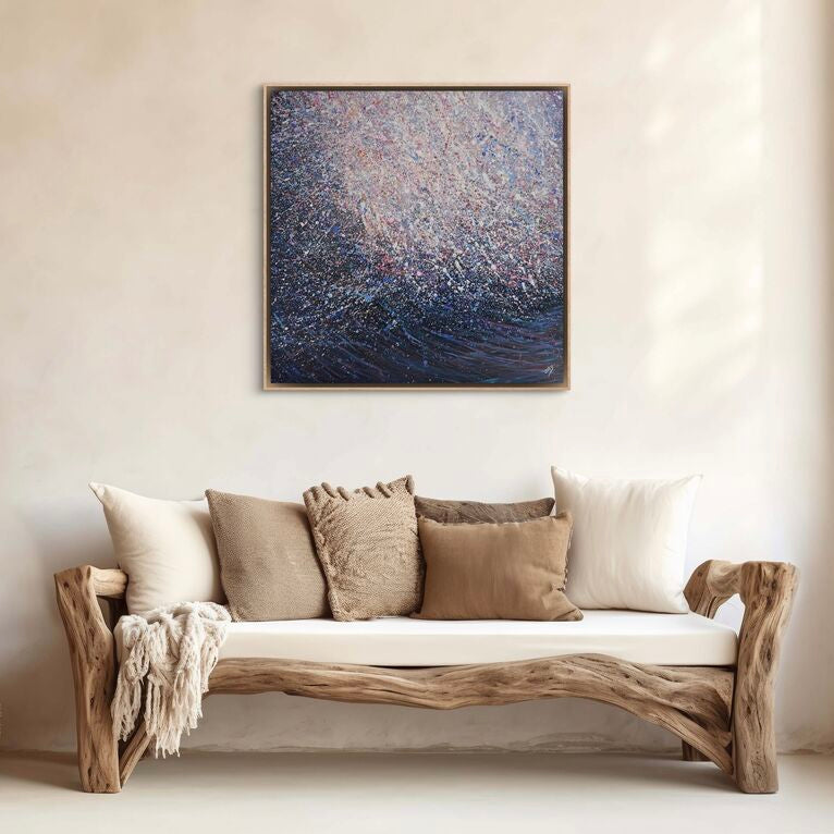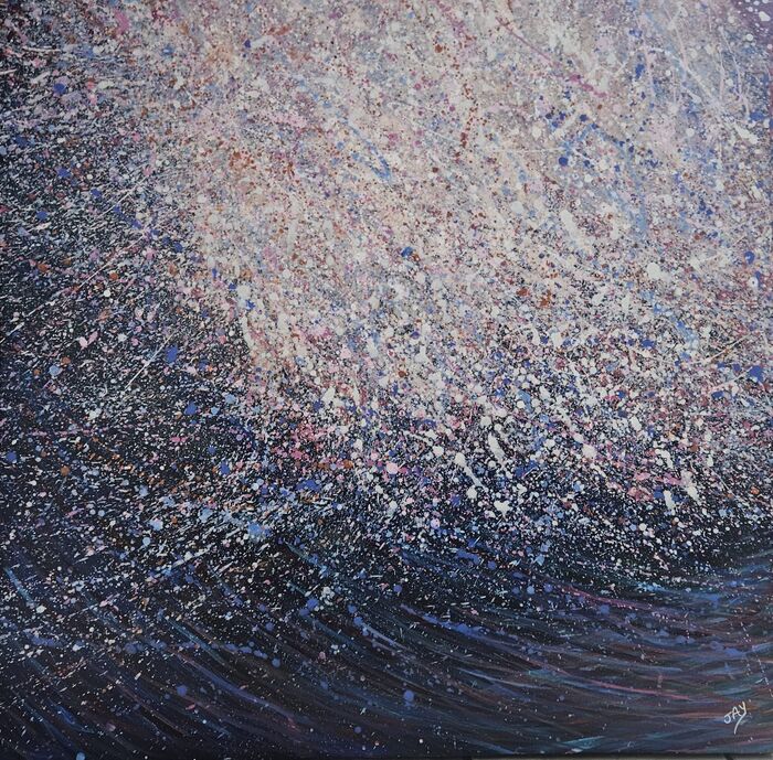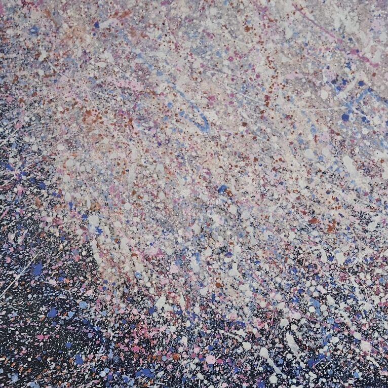 Acrylic and gloss varnish on canvas , in dreamy sunset colours pink, purple and navy blue. Colours may appear different on your monitor and screen.