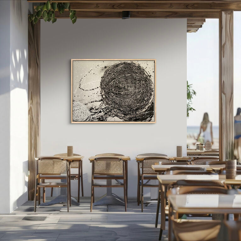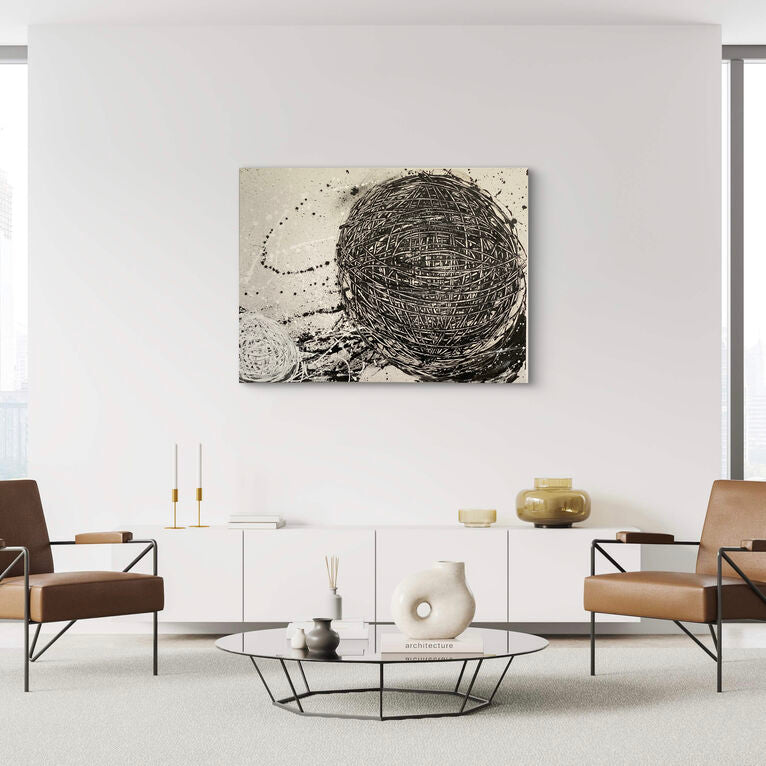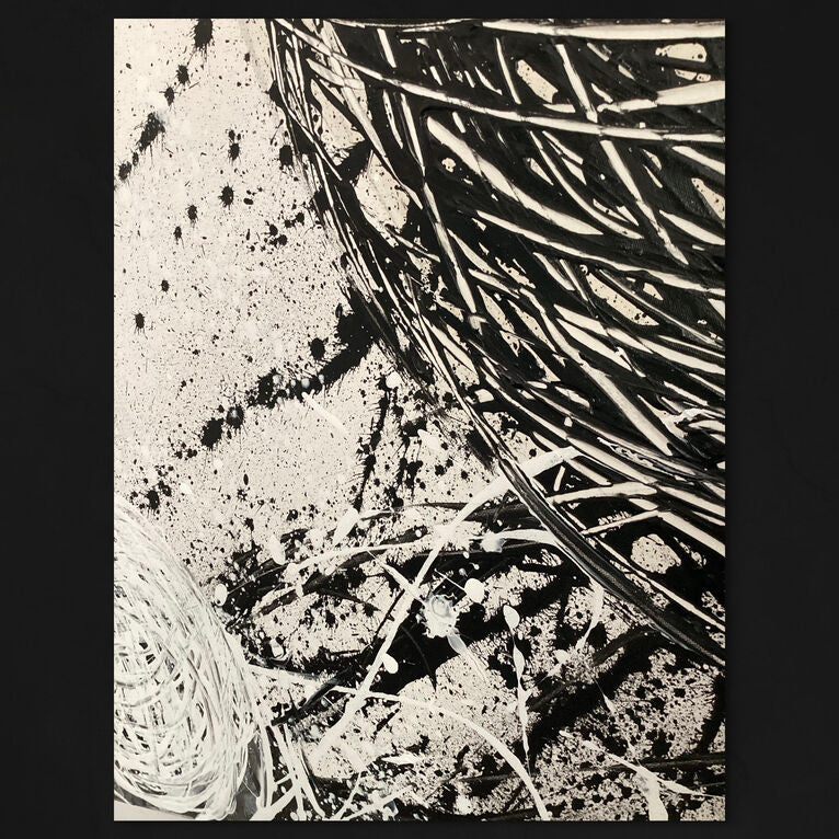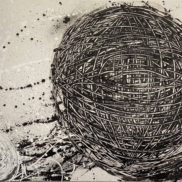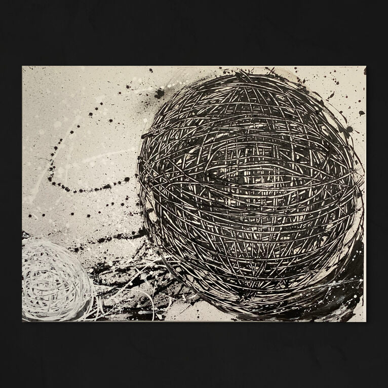"Tangled Mess" is an expressive black and white acrylic painting that captures the chaos of an unraveling ball of string. The dynamic forms and contrasts invite viewers to explore themes of complexity and entanglement, reflecting the intricacies of life and emotion.