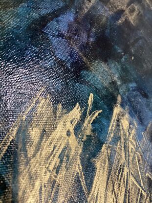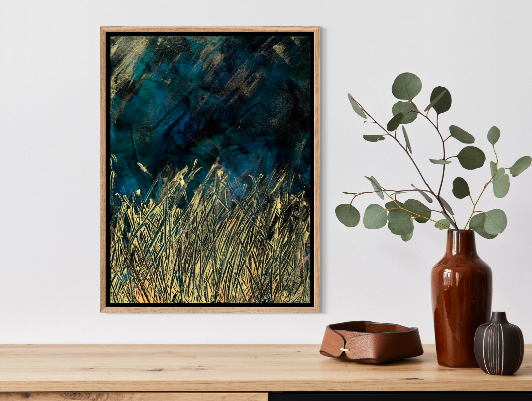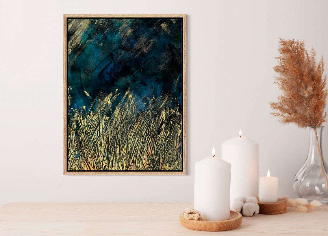 This piece captures the serene moment preceding an impending storm. A wheat field, its golden hues contrasted against a darkening sky, awaits the imminent arrival of turbulent weather. The painting invites viewers to witness the tranquility and tension of nature’s calm before the storm. I love the way the light transforms the alcohol ink showing different colours depending on where you view this piece in your room.